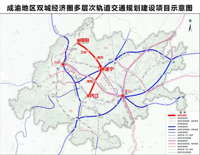 綿遂內(nèi)鐵路是國家《中長期鐵路網(wǎng)規(guī)劃》《成渝地區(qū)雙城經(jīng)濟(jì)圈多層次軌道交通規(guī)劃》鐵路網(wǎng)的重要組成部分,已列入國家、四川省“十四五”規(guī)劃建設(shè)項(xiàng)目,是四川繼川南城際鐵路、漢巴南鐵路之后,由地方主導(dǎo)投資建設(shè)的第三條高速鐵路項(xiàng)目,對于構(gòu)建川北、川南、川中區(qū)域城際鐵路環(huán)線,加快推動(dòng)成渝地區(qū)雙城經(jīng)濟(jì)圈綜合交通運(yùn)輸體系高質(zhì)量發(fā)展,完善國家綜合立體交通網(wǎng)具有重要意義。按照省政府“一次規(guī)劃設(shè)計(jì)、分步分段建設(shè)”的工作安排,先期實(shí)施綿陽至遂寧段。