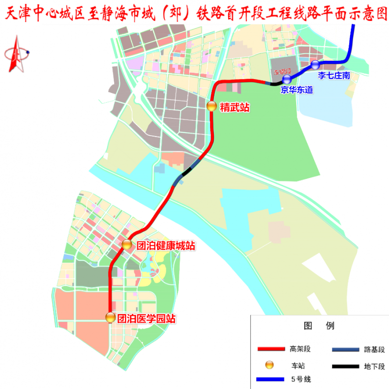 天津中心城區(qū)至靜海市域(郊)鐵路首開段工程南起團(tuán)泊醫(yī)學(xué)園站,途經(jīng)團(tuán)泊新城和精武鎮(zhèn),最終與地鐵5號(hào)線京華東道站接軌。線路全長(zhǎng)約13.4km,共設(shè)車站3座,均為高架站,分別為團(tuán)泊醫(yī)學(xué)園站、團(tuán)泊健康城站、精武站。