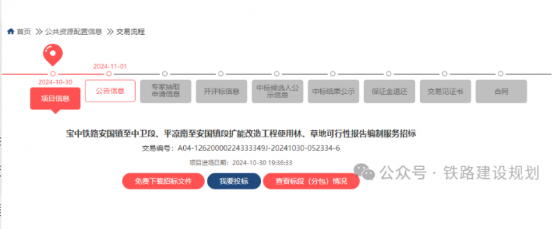 11月1日,寶中鐵路安國鎮至中衛段(寧夏段)擴能改造工程勘測定界報告、臨時用地土地復墾方案編制以及中衛至平涼南段使用林、草地可行性報告編制等3個技術服務招標公告發布。