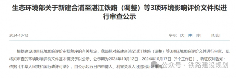 今年10月12日,生態(tài)環(huán)境部發(fā)布了《關(guān)于新建合浦至湛江鐵路(調(diào)整)等3項(xiàng)環(huán)境影響評(píng)價(jià)文件擬進(jìn)行審查公示》,正式對(duì)合湛高鐵、長(zhǎng)贛高鐵和銅吉鐵路環(huán)境影響評(píng)價(jià)文件進(jìn)行審查。目前,合湛、銅吉鐵路環(huán)評(píng)已正式獲批。