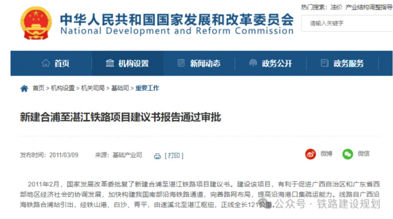 2011年2月,國(guó)家發(fā)展改革委批復(fù)了新建合浦至湛江鐵路項(xiàng)目建議書。