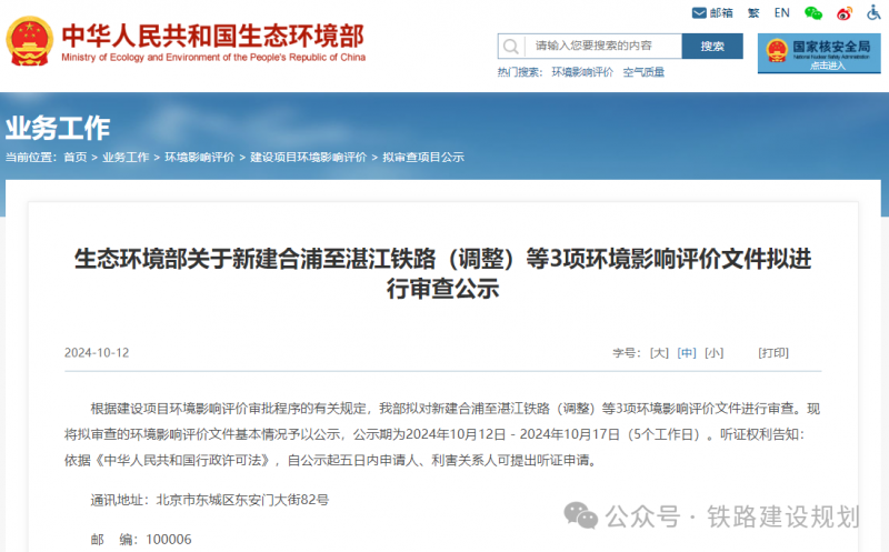 此前10月12日,生態環境部發布了《關于新建合浦至湛江鐵路(調整)等3項環境影響評價文件擬進行審查公示》,正式對合湛高鐵、長贛高鐵和銅吉鐵路環境影響評價文件進行審查。