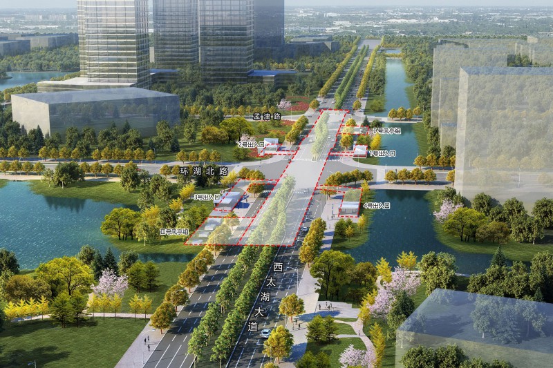 攬月灣站是5號線從西南到東北的起始站,車站主體布置在西太湖大道與環湖北路交叉口處,沿西太湖大道南北向一字型敷設,下穿環湖北路、孟津路。車站設計為地下二層島式站臺車站,總長度347.1m,總建筑面積16869.28㎡,設置2個風亭及4個出入口。