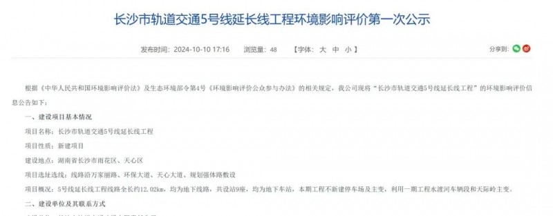 長沙軌道交通公司官網發布:長沙市軌道交通5號線延長線(原長沙地鐵5號線南延)工程環境影響評價第一次公示。