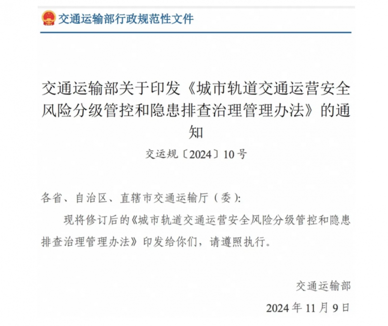 近期,交通部修訂發布了《城市軌道交通運營安全風險分級管控和隱患排查治理管理辦法》。