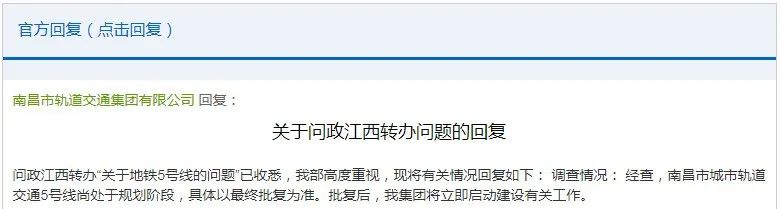 【官方回復(fù)】南昌市軌道交通集團(tuán)有限公司回復(fù):問政江西轉(zhuǎn)辦“關(guān)于地鐵5號線的問題"已收悉,我部高度重視,現(xiàn)將有關(guān)情況回復(fù)如下:調(diào)查情況:經(jīng)查,南昌市城市軌道交通5號線尚處于規(guī)劃階段,具體以最終批復(fù)為準(zhǔn)。批復(fù)后,我集團(tuán)將立即啟動建設(shè)有關(guān)工作。
