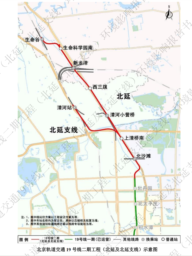 根據(jù)本次公布的環(huán)評報告,19號線二期北延及北延支線全長約24.2公里,共設(shè)8座車站。其中,北延線路南起一期工程牡丹園站,北至生命谷站,全長約17.1公里,其中地下線16.1公里、U 槽及地面段約1.0公里,設(shè)站7座;北延支線由主線上清橋南站接軌,北至清河站,全長約7.1公里,全部為地下線,設(shè)站1座,為清河站。