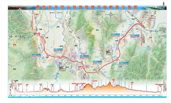 新建焦作至平頂山鐵路,線路起自鄭太高鐵玨山線路所,向南經焦作市轄沁陽市,濟源市,跨黃河后引入鄭西高鐵洛陽龍門站,經洛陽市伊川、汝陽縣,平頂山市轄汝州市,接入鄭渝高鐵平頂山西站。其中:全長6.34公里的邙山隧道和洛陽黃河公鐵兩用大橋被列為重點控制性工程。