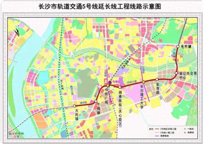 據悉,5號線延長線工程在規劃數谷大道與強體路交叉口設大托鋪站,出站后線路由強體路轉向東北沿天心大道敷設,于天心大道與新電路交叉口設牛角塘站,出站后線路轉向東,在芙蓉路與托子沖路交叉口北側設中信廣場站,與1號線、長株潭城際鐵路換乘。之后線路下穿長株潭城際高架后轉向東南沿環保大道敷設,依次在湘雅醫院(天心院區)路口設湘雅醫院(天心院區)站;在匯金路路口設長沙理工大學站,與在建7號線換乘;在金海路口設金海路站,出站后線路繼續沿環保大道向東,在萬家麗路口轉向北沿萬家麗路敷設,在省公共交易中心口北側設省公共交易中心站;出站后向北接入一期工程起點毛竹塘站。