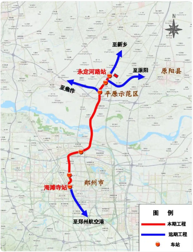線路主要經過鄭州市金水區、惠濟區以及新鄉市平原新區,全長約36.8公里,其中高架段26.32公里、地下段10.13公里、過渡段0.35公里,設站6座,其中高架站4座、地下站2座,設平原新區動車所1座。