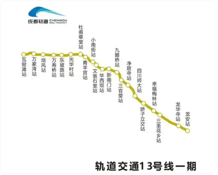 13號線一期為成都首條采用市域A型車的全自動運行軌道交通線路,線路最高運行速度為100km/h,西起瓦窯灘站,東至龍安站,線路全長29.07km,均為地下線路,共設車站21座,其中換乘站11座,覆蓋青羊區、武侯區、錦江區、龍泉驛區等核心區域,開通后將加強龍泉驛區與中心城區的聯系,并有效提高區域軌道交通網絡的通達性。