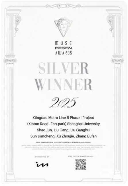 青島地鐵6號線一期工程空間一體化設(shè)計憑借卓越的一體化創(chuàng)意與深厚的文化表達(dá),榮獲2025年美國繆斯設(shè)計獎(MUSE Design Awards)銀獎。