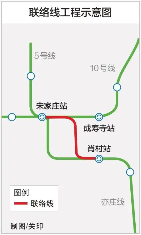 聯(lián)絡(luò)線工程南起朝陽區(qū)肖村站(不含),北至豐臺區(qū)宋家莊站(不含),線路全長約2.7公里,其中新建地下線路約2.2公里,利用既有線路0.5公里,均為地下線,無新建、改(擴)建場站。地下區(qū)間結(jié)構(gòu)采用盾構(gòu)法、明挖法和暗挖法施工,無爆破作業(yè)。