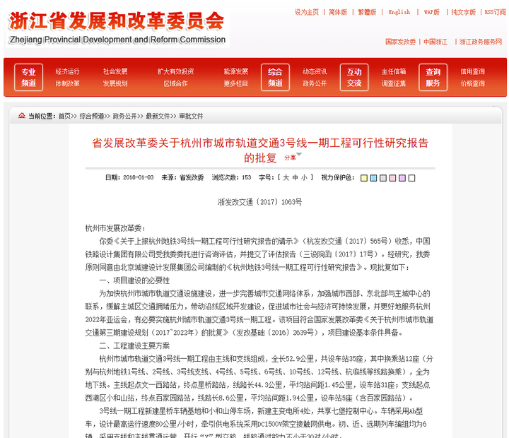 1月3日,浙江省發改委官網公布了《省發展改革委關于杭州市城市軌道交通3號線一期工程可行性研究報告的批復》(以下簡稱“《批復》”)。