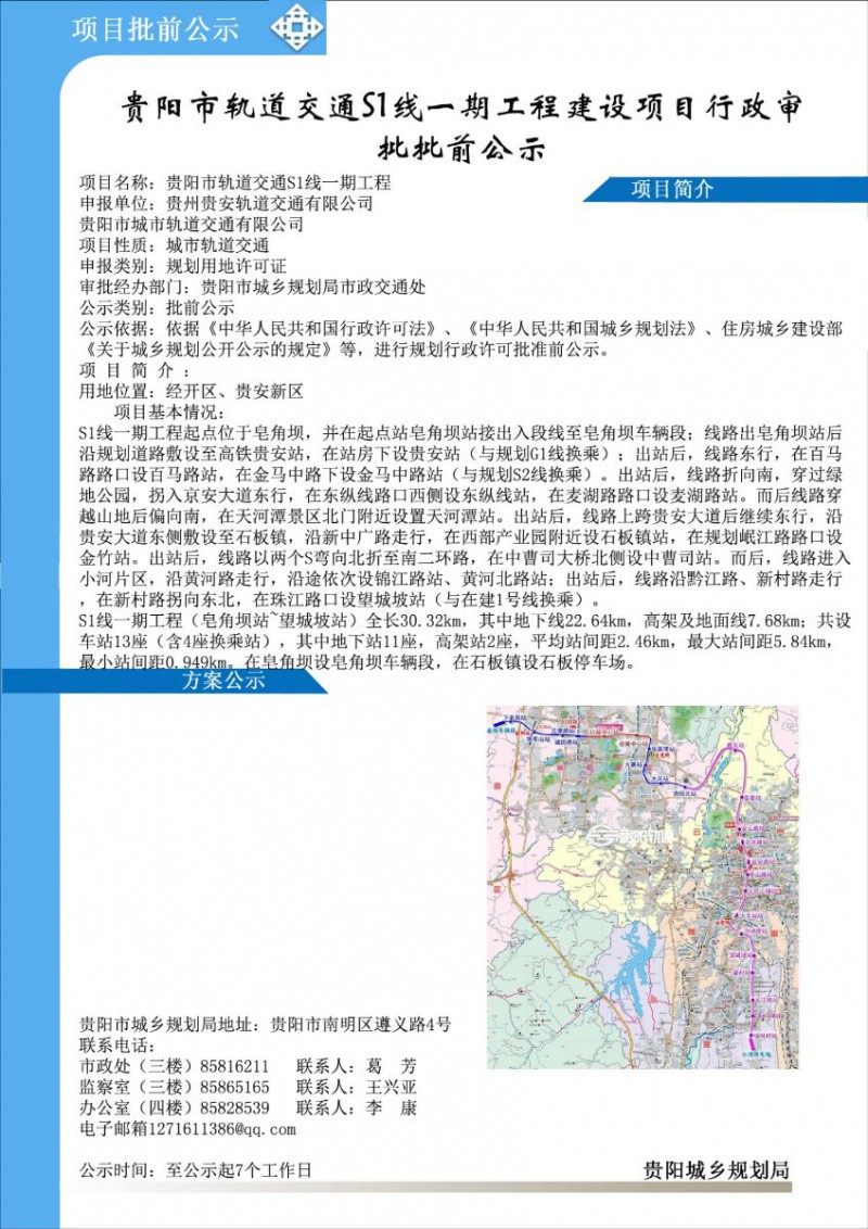 5月9日,貴陽市城鄉規劃局對貴陽市軌道交通S1線一期工程建設項目進行行政審批批前公示。