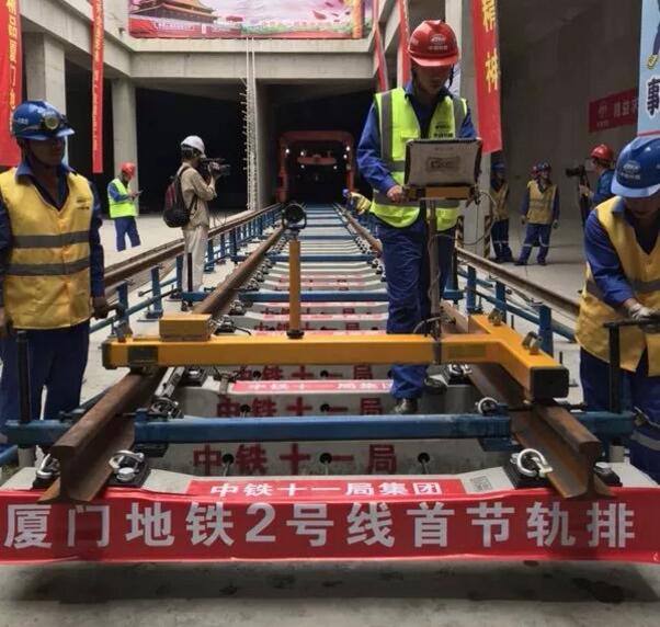 2018年5月4日上午10時,廈門地鐵2號線嶺兜鋪軌基地,鋪軌龍門吊將首節(jié)軌排起吊至軌排井口,軌道施工人員將軌排放至鋪設(shè)區(qū)段,首節(jié)軌排鋪設(shè)完成。地鐵2號線正式拉開鋪軌施工序幕!