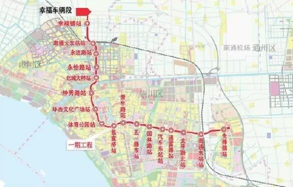 按可研報告,2號線一期工程串聯港閘區、崇川區和通州區,依次連接幸福街道、南通火車站、市北新城、老城區、南通大學城、南通汽車東站、觀音新城、南通火車東站和先鋒鎮等重要節點,是一條貫穿城市南北和東西方向的骨干線路。線路長約21.04公里,全線共設17座車站,平均站間距1.27公里,均為地下線路。設幸福車輛段一座,與在建1號線共享控制中心。一期工程計劃2018年底開工建設,2023年6月建成。
