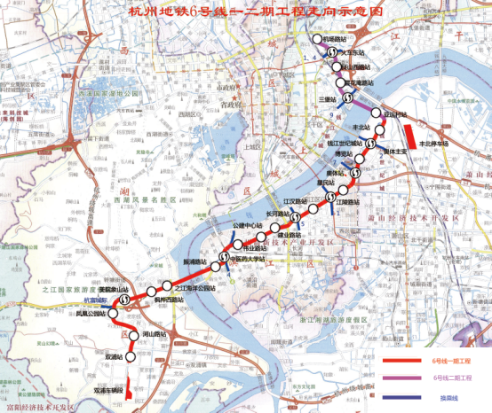 二期工程(豐北站-機(jī)場路站),從一期終點站豐北站出發(fā),往東二次穿越錢塘江后一路往北,進(jìn)入主城區(qū),經(jīng)過三堡(換乘9號線)至火車東站后止于機(jī)場路站。在亞運會期間,將承擔(dān)起連接高鐵站點和亞運場館的疏通重?fù)?dān)。