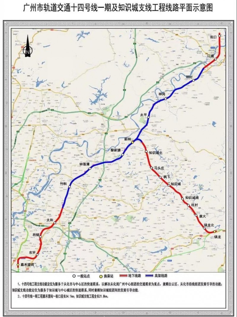 許坤杰介紹,十四號線一期(嘉禾望崗至街口段)全長約54.3公里,共設(shè)13座車站,其中地下站6座(嘉禾望崗、東平、石湖、太和、江埔、街口)、高架站7座(竹料站、鐘落譚站、黎家塘站、新和站、太平站、神崗站、鄧村)。高架段約32公里,始于白云鐘落潭鎮(zhèn)大羅村,止于從化街口赤草村,主要沿現(xiàn)有道路中間敷設(shè)。十四號線是落實廣州城市“北優(yōu)”戰(zhàn)略、實現(xiàn)從化與城市中心區(qū)快速聯(lián)系的交通線路,其功能上重點(diǎn)是解決從化到廣州中心組團(tuán)的交通需求,兼顧引導(dǎo)白云區(qū)、從化區(qū)沿線組團(tuán)的發(fā)展。