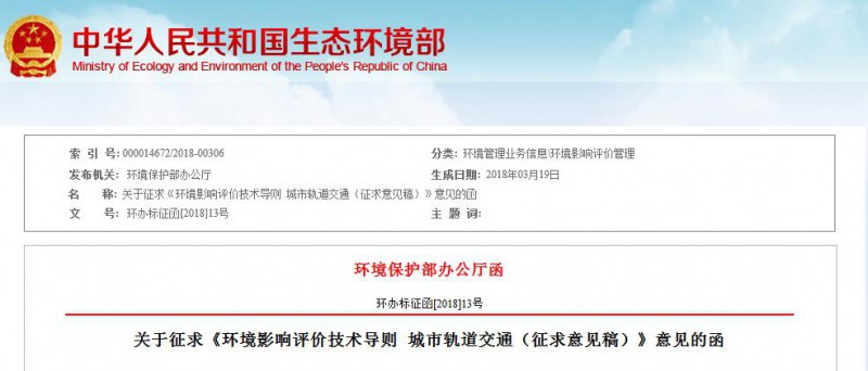為進一步完善環境影響評價導則體系,強化城市軌道交通影響評價技術要求,充分發揮環境影響評價從源頭預防環境污染和生態破壞的作用,我部決定修訂《環境影響評價技術導則 城市軌道交通(征求意見稿)》(以下簡稱《導則》)。目前,《導則》編制單位已完成征求意見稿。為進一步做好編制工作,根據國家環境保護標準制修訂工作管理規定,現就該《導則》征求意見稿征求你單位意見,請于2018年4月26日前通過信函或電子郵件方式將意見反饋我部,逾期未反饋意見的將按照無意見處理。標準征求意見稿及編制說明可登錄我部網站(http://www.mep.gov.cn/)“意見征集”欄目檢索查閱。