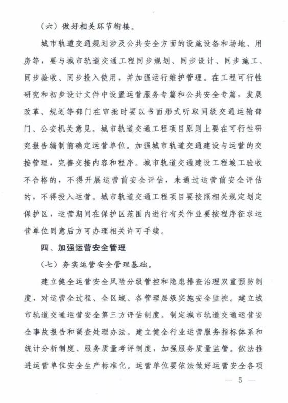 城市軌道交通規(guī)劃涉及公共安全方面的設(shè)施設(shè)備和場地、用房等,要與城市軌道交通工程同步規(guī)劃、同步設(shè)計(jì)、同步施工、同步驗(yàn)收、同步投入使用,并加強(qiáng)運(yùn)行維護(hù)管理。在工程可行性研究和初步設(shè)計(jì)文件中設(shè)置運(yùn)營服務(wù)專篇和公共安全專篇,發(fā)展改革、規(guī)劃等部門在審批時要以書面形式聽取同級交通運(yùn)輸門、公安機(jī)關(guān)意見。城市軌道交通工程項(xiàng)目原則上要在可行性研究報告編制前確定運(yùn)營單位。