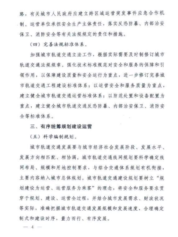 城市軌道交通發(fā)展要與城市經(jīng)濟(jì)社會發(fā)展階段、發(fā)展水平、發(fā)展方向相匹配、相協(xié)調(diào)。城市軌道交通線網(wǎng)規(guī)劃要科學(xué)確定線網(wǎng)布局、規(guī)模和用地控制要求, 與綜合交通體系規(guī)劃有機(jī)銜接,主要內(nèi)容納入城市總體規(guī)劃。城市軌道交通建設(shè)規(guī)劃要樹立"規(guī)劃建設(shè)為運(yùn)營、運(yùn)營服務(wù)為乘客"的理念,將安全和服務(wù)要求貫穿于規(guī)劃、建設(shè)、運(yùn)營全過程,并結(jié)合城市發(fā)展需求、財政狀況等實(shí)際,準(zhǔn)確把握城市軌道交通發(fā)展規(guī)模和發(fā)展速度,合理確定制式和建設(shè)時序,量力而行、有序發(fā)展。