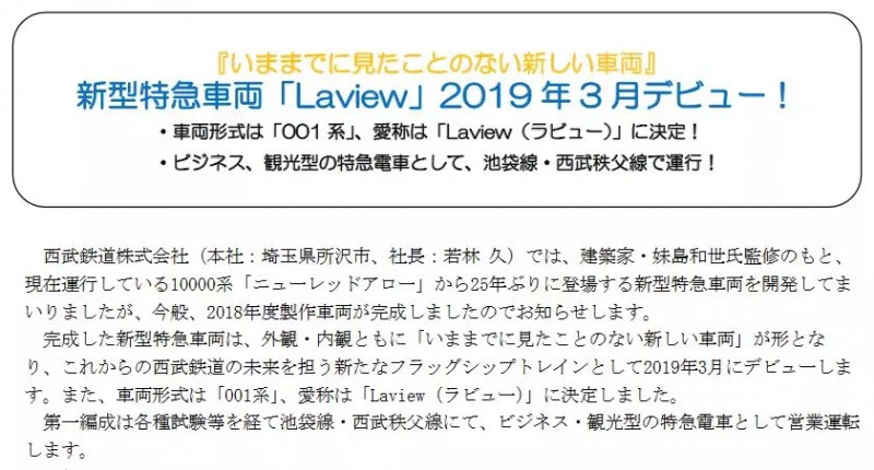 據日本朝日新聞消息:日本西武鐵路于29日宣布,2019年3月起將在西武池袋線、西武秩父線亮相的新型特快列車“001系”的昵稱為“Laview”。