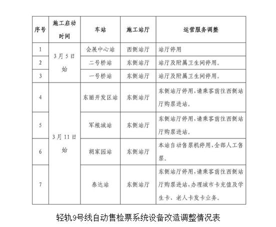3月5日至5月底,會展中心、一號橋、二號橋、東麗開發區、軍糧城、胡家園、泰達等7個車站自動售檢票系統將進入首批施工改造。