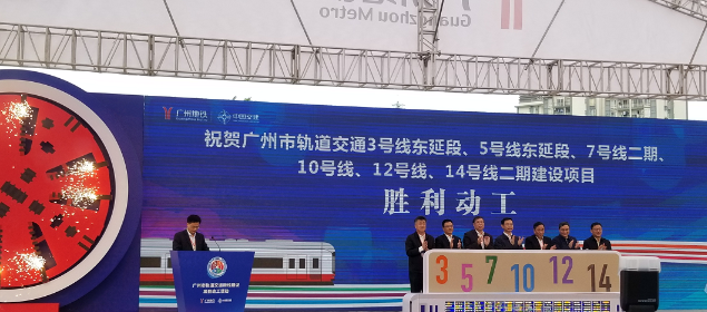 隨著廣州市市長溫國輝、常務副市長陳志英、廣州地鐵集團董事長丁建隆、交建總裁宋海良、鐵建總裁莊向標、中鐵副總裁劉輝、北京建工董事長樊軍手中的彩色金沙緩緩注入新線開工啟動裝置,廣州地鐵三號線東延段、五號線東延段、七號線二期、十號線、十二號線、十四號線二期等6條新線正式開工建設,拉開了廣州市新一輪軌道交通建設的序幕。