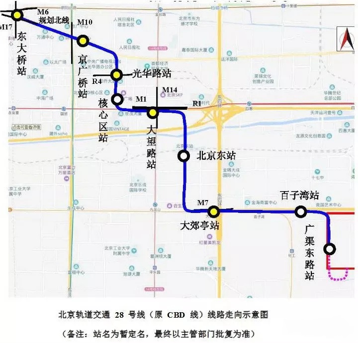 此外,28號線在東大橋站可以換乘已經運營的6號線和正在建設的17號線,在光華路站可以換乘規劃中的R4線,在大望路站可以換乘1號線和14號線,在大郊亭站可以換乘7號線。