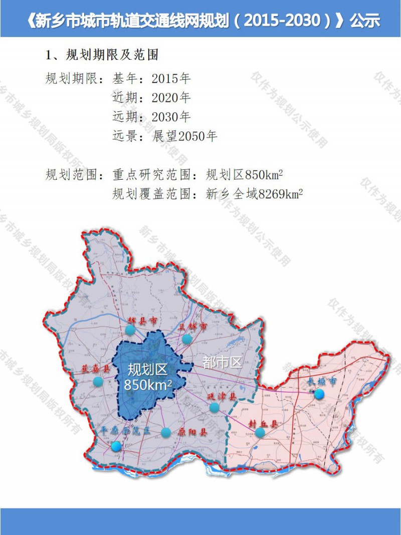 規劃期限:基年:2015年近期:2020年遠期:2030年遠景:展望2050年規劃范圍:重點研究范圍:規劃區850平方公里規劃覆蓋范圍:新鄉全域8269平方公里