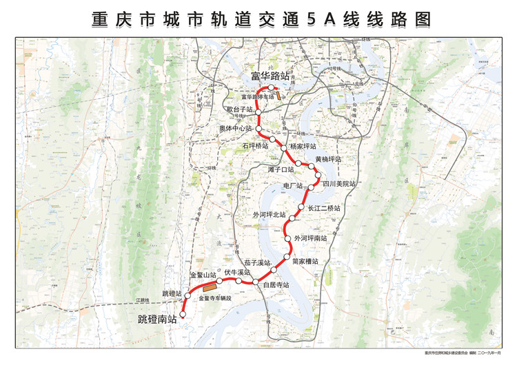全長(zhǎng)29公里,共設(shè)車站19座(地下站12座,高架站7座),投資226億元,5A線是南北向骨干線路,強(qiáng)化渝中、九龍坡、巴南、大渡口之間快速聯(lián)系,兩次跨越長(zhǎng)江,串聯(lián)渝中半島、楊家坪商圈、奧體中心、九龍半島、李家沱和大渡口組團(tuán)等重要節(jié)點(diǎn)和區(qū)域,對(duì)帶動(dòng)主城南部發(fā)展、緩解核心區(qū)交通擁堵具有重要作用。