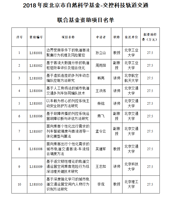 北京市自然科學(xué)基金-交控科技軌道交通聯(lián)合基金管理辦公室完成了2018年度北京市自然科學(xué)基金-交控科技軌道交通聯(lián)合基金擬資助項目公示工作,公示期間未收到異議申請。