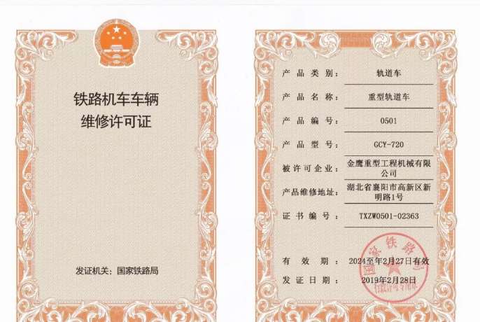 近日,國家鐵路局頒布了新的行政許可公告,金鷹重工喜獲GCY-720型重型軌道車維修許可證書。該證書的獲得標志著公司產品大修能力再次獲得國家鐵路局認可,公司產品維修資質進一步完善。截至目前公司共取得維修許可證22個,基本涵蓋鐵路工程機械行業主流車型。