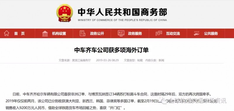 2019年僅僅前兩月,該公司已分別收獲澳大利亞、新西蘭、韓國、菲律賓等多國訂單,截至2月19日已實現海外簽約8700萬美元,預計實現銷售收入9200萬元人民幣,借助全球鐵路貨車市場回暖之勢,喜獲“開門紅”。