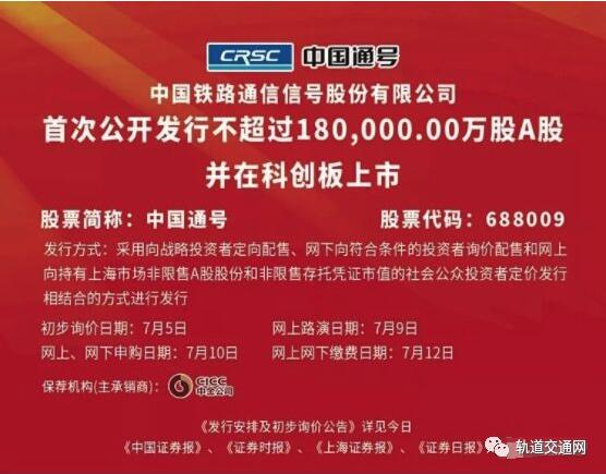 7月2日,鐵路通信信號股份有限公司(以下簡稱“通號”)公開披露《首次公開發行股票并在科創板上市招股意向書》,正式啟動科創板IPO發行工作,擬發行量不超過 180,000.00萬股,占發行后總股本17%,將成為登陸科創板的首家大型央企和A+H股的科創板上市公司。
