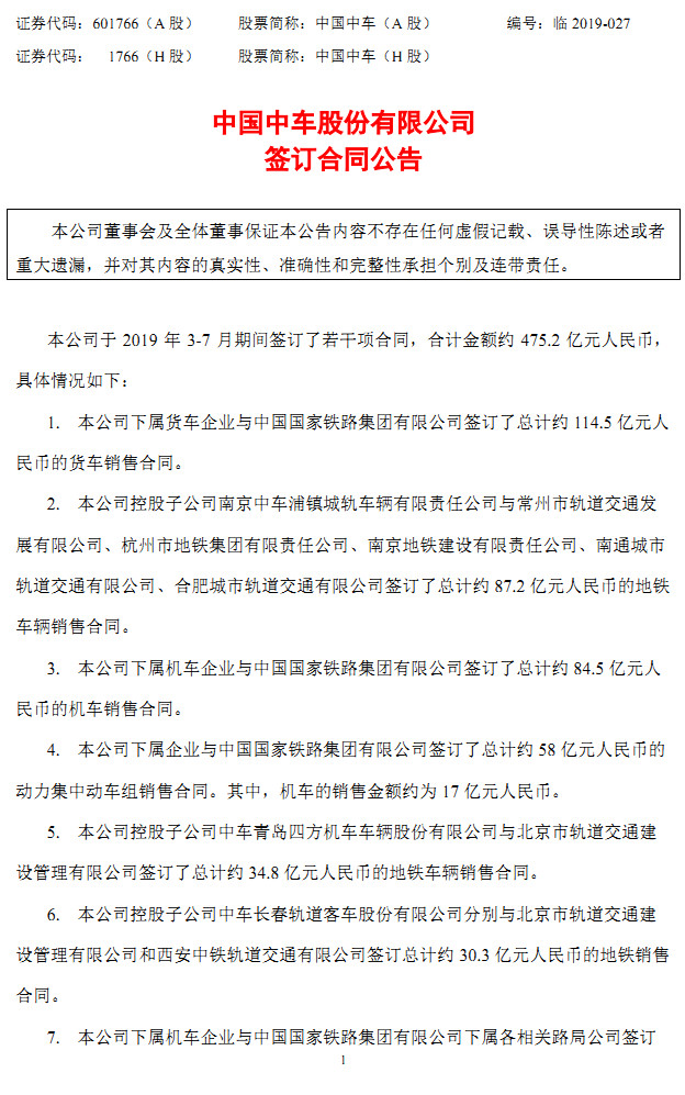 中車于2019年3-7月期間簽訂了若干項合同,合計金額約475.2億元人民幣,具體情況如下: