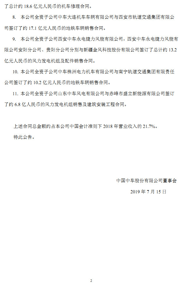 8.中車全資子公司中車大連機車車輛有限公司與西安市軌道交通集團有限公司簽訂了約17.1億元人民幣的地鐵車輛銷售合同。