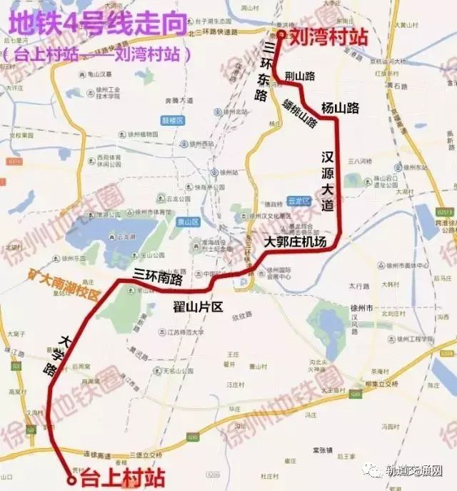 4號(hào)線起自 G30 連霍高速南側(cè)的臺(tái)上村站,向北沿規(guī)劃路——新茶線——大學(xué)路——三環(huán)南路經(jīng)翟山片區(qū),到達(dá)大郭莊機(jī)場(chǎng)片區(qū)。后沿漢源大道——楊山路——蟠桃山路——金水路——荊山路——三 環(huán)東路向北敷設(shè),終點(diǎn)位于劉灣村站。