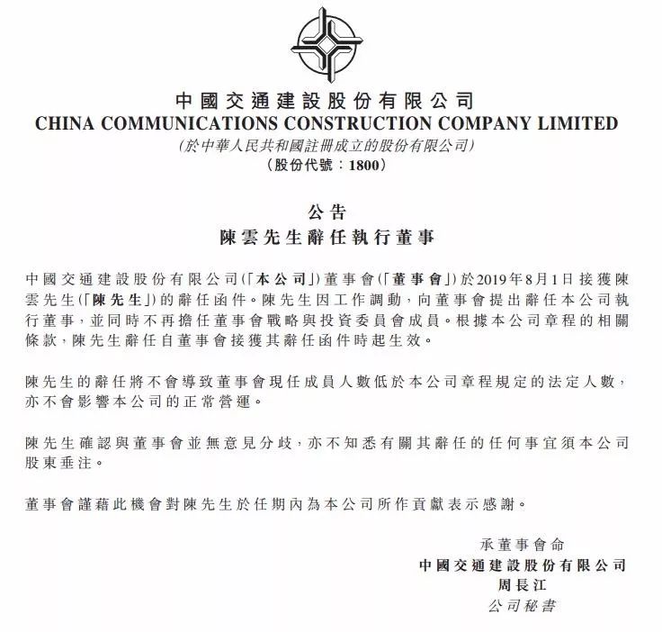 2019年8月2日,交通建設股份有限公司發布公告(臨2019-057號),公司董事會收到陳云先生的辭呈。陳云先生因工作調動,辭去公司執行董事、公司董事會戰略與投資委員會委員的職務。該辭呈自2019年8月1日起生效。
