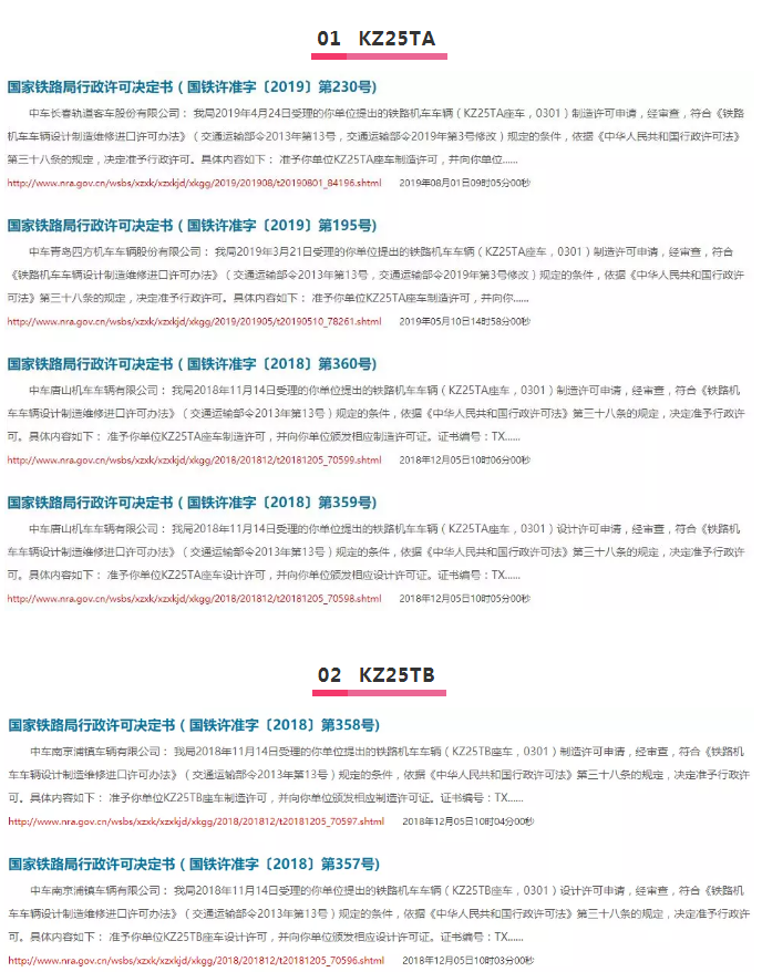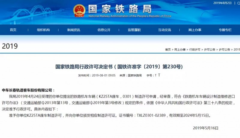 據國家鐵路局官網8月1日消息:中車長客提出的鐵路機車車輛(KZ25TA座車,0301)已于5月中旬獲制造許可。