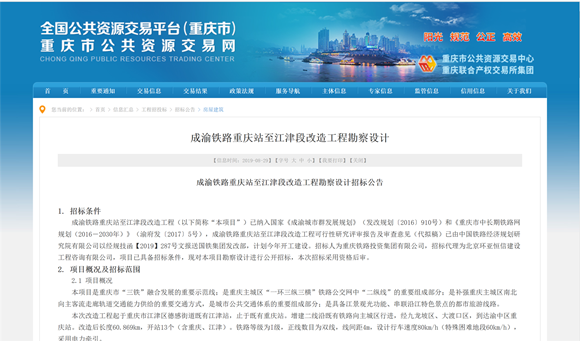 此外,華龍網-新重慶客戶端記者還注意到,成渝鐵路重慶站至江津段改造工程勘察設計的招標人為重慶鐵路投資集團有限公司。這也是重慶鐵路投資集團在重慶市公共資源交易網的首個招標項目。