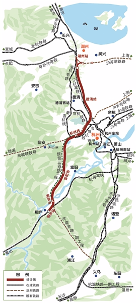 湖杭鐵路是杭州西站南北向引入的高鐵線路。北段湖州至杭州西是商合杭鐵路的組成部分,南段杭州西至桐廬既是杭黃鐵路連接線,又是杭溫鐵路的組成部分。線路從既有寧杭高鐵湖州站引出,經湖州市南太湖新區、吳興區、德清縣,杭州市余杭區、西湖區、富陽區和桐廬縣,跨富春江新設桐廬東站后引入杭黃高鐵桐廬站,新建線路長135.788公里,總投資370.27億元(含同步實施工程),設計時速350公里。