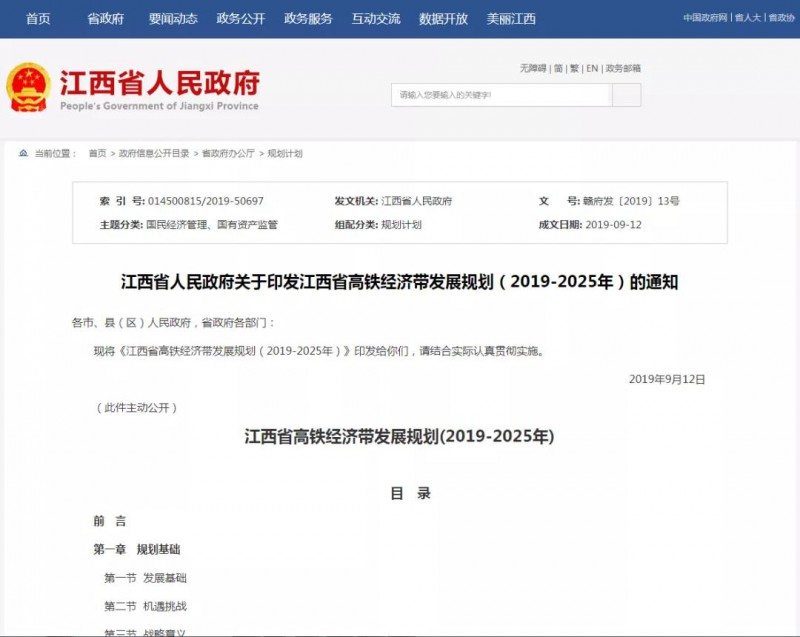 10月8日,記者從江西省人民政府官網獲悉,《江西省高鐵經濟帶發展規劃(2019-2025年)》(下稱《規劃》)出爐并印發,規劃期為2019-2025年,遠期展望到2035年。