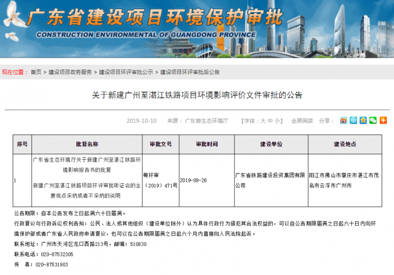10月10日,廣東省生態(tài)環(huán)境廳關(guān)于新建廣州至湛江鐵路環(huán)境影響報(bào)告書的批復(fù)。
