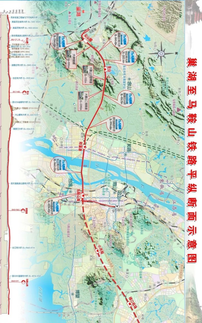 擬新建車站3個,利用車站2個,全線橋梁17座,隧道4座,跨江采用全橋梁建設方式(全長約9.6公里),項目總投資概算約246億元。遠期在馬鞍山南站東延經南京祿口機場,接入蘇南沿江鐵路句容站,可達上海和蘇中。