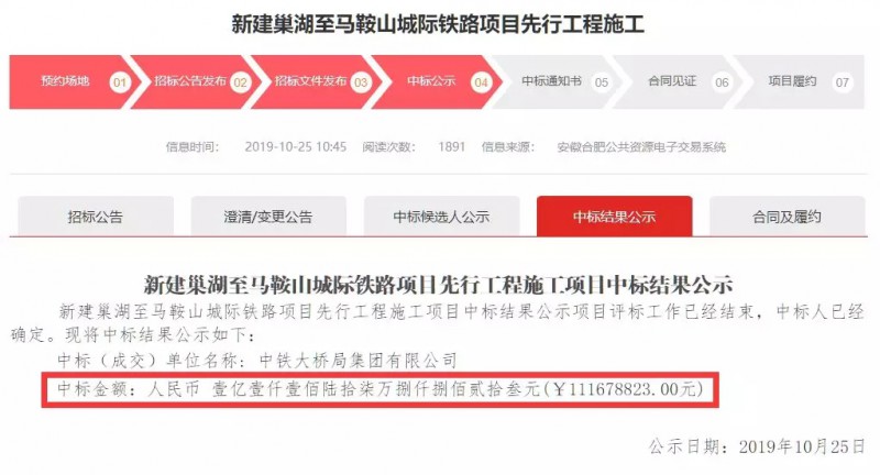 10月25日“新建巢湖至馬鞍山城際鐵路項目先行工程施工項目中標結果公示”中鐵大橋局集團有限公司以111678823.00元中標。