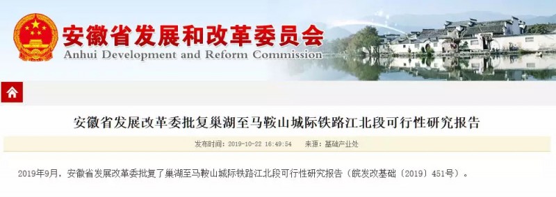 新建巢湖至馬鞍山城際鐵路江北段已獲《安徽省發展改革委關于巢湖至馬鞍山城際鐵路江北段可行性研究報告的批復》(皖發改基礎〔2019〕451)號批復。