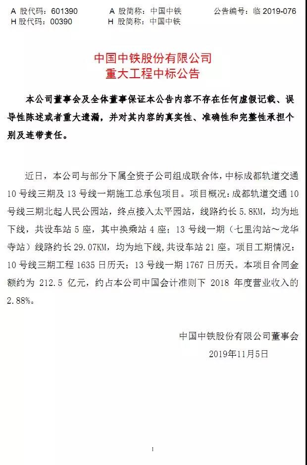 11月4日晚,中鐵發(fā)布公告稱,公司與部分下屬全資子公司組成聯(lián)合體,中標(biāo)成都軌道交通10號(hào)線三期及13號(hào)線一期施工總承包項(xiàng)目。本項(xiàng)目合同金額約為212.5億元,約占本公司會(huì)計(jì)準(zhǔn)則下2018年度營業(yè)收入的2.88%。