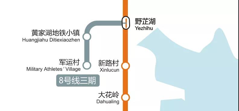 軌道交通8號(hào)線三期工程是唯一直接連通軍運(yùn)村的軌道交通線路,線路全長(zhǎng)4.84公里。全線起于野芷湖,設(shè)站3座,分別為:野芷湖站、黃家湖地鐵小鎮(zhèn)站、軍運(yùn)村站。